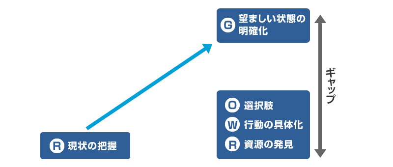 これに添った問いによって、現状と望ましい状態(未来)のギャップを解消する方法を発見し、コーチは行動の後押しをします。