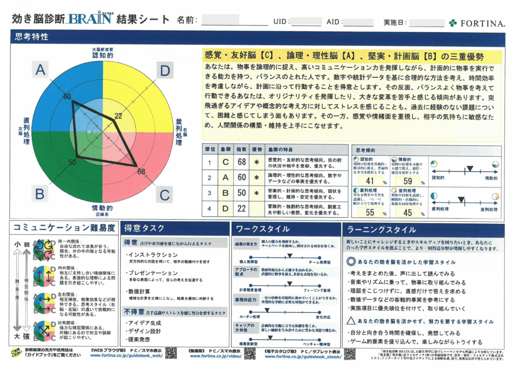 株式会社フォルティナ「効き脳診断 BRAIN」結果シート