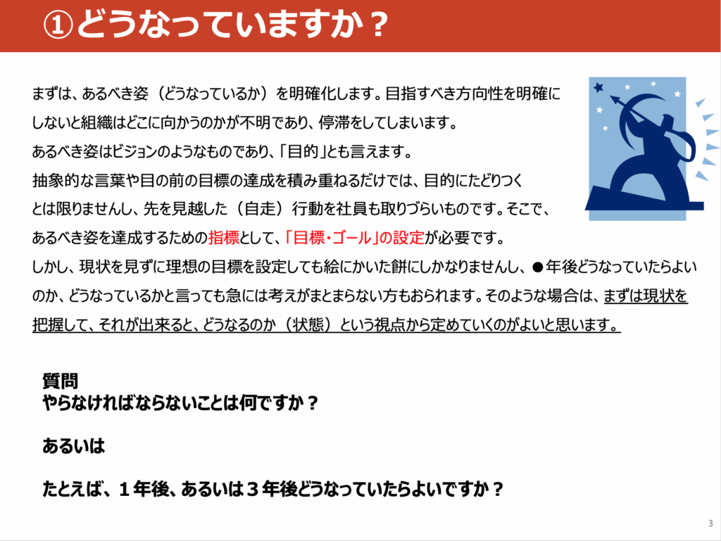 現状と目指す理想の組織の状態(ビジョン)お聞かせいただき、真の課題は何かを明確にしてどのようにギャップを埋めていくかを共有します。